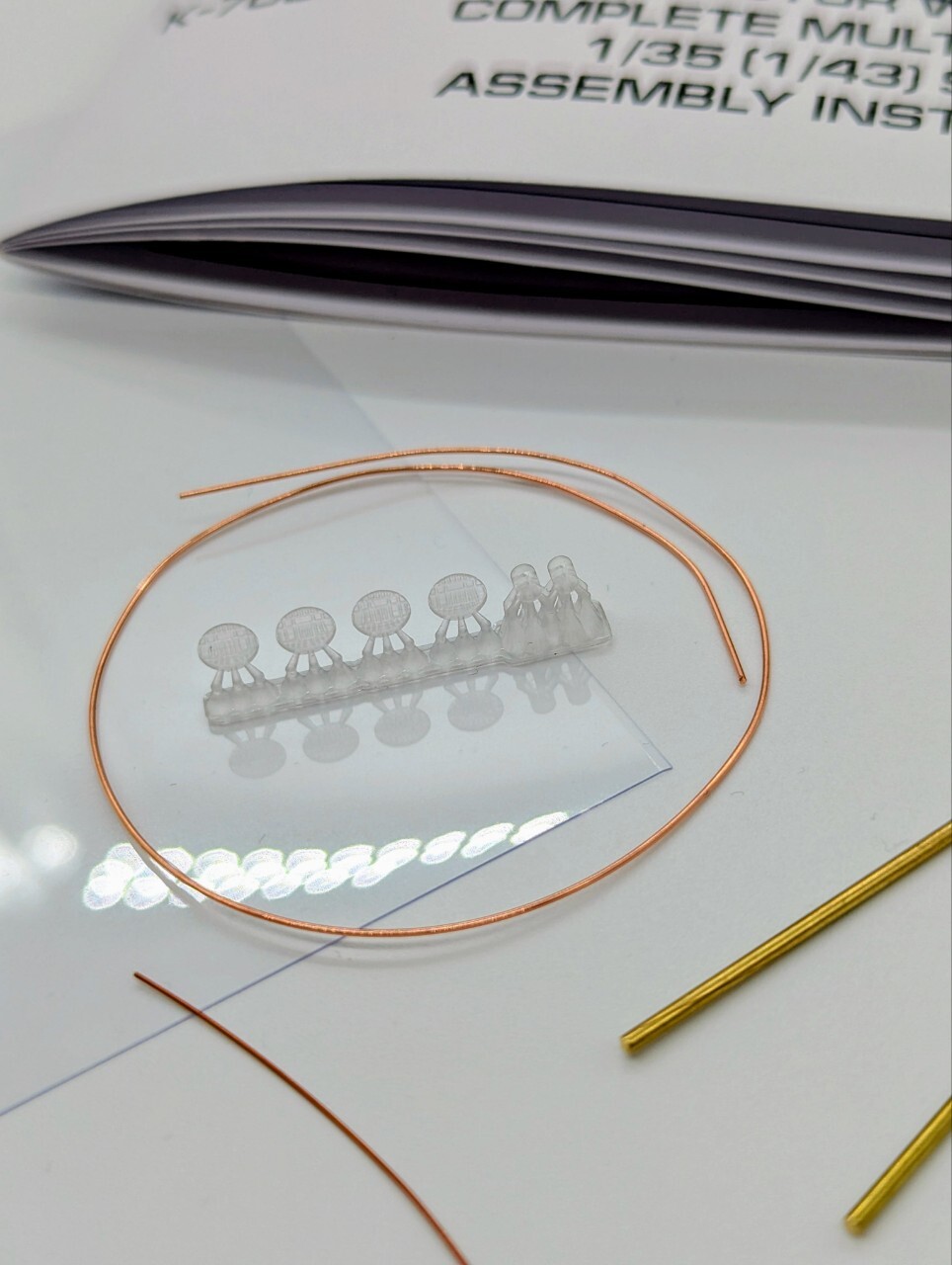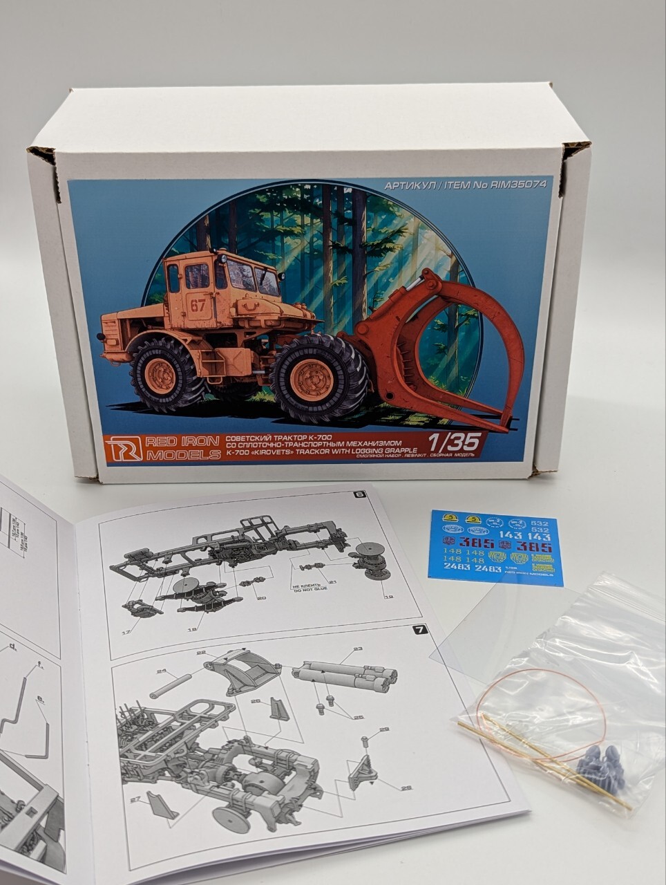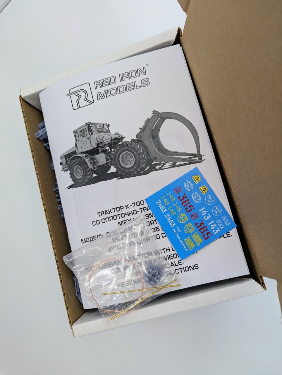 В коробке:149 обычных и 6 прозрачных деталей из акриловой смолы, 2 оси, проволока, пленка, декаль и подробная инструкция.